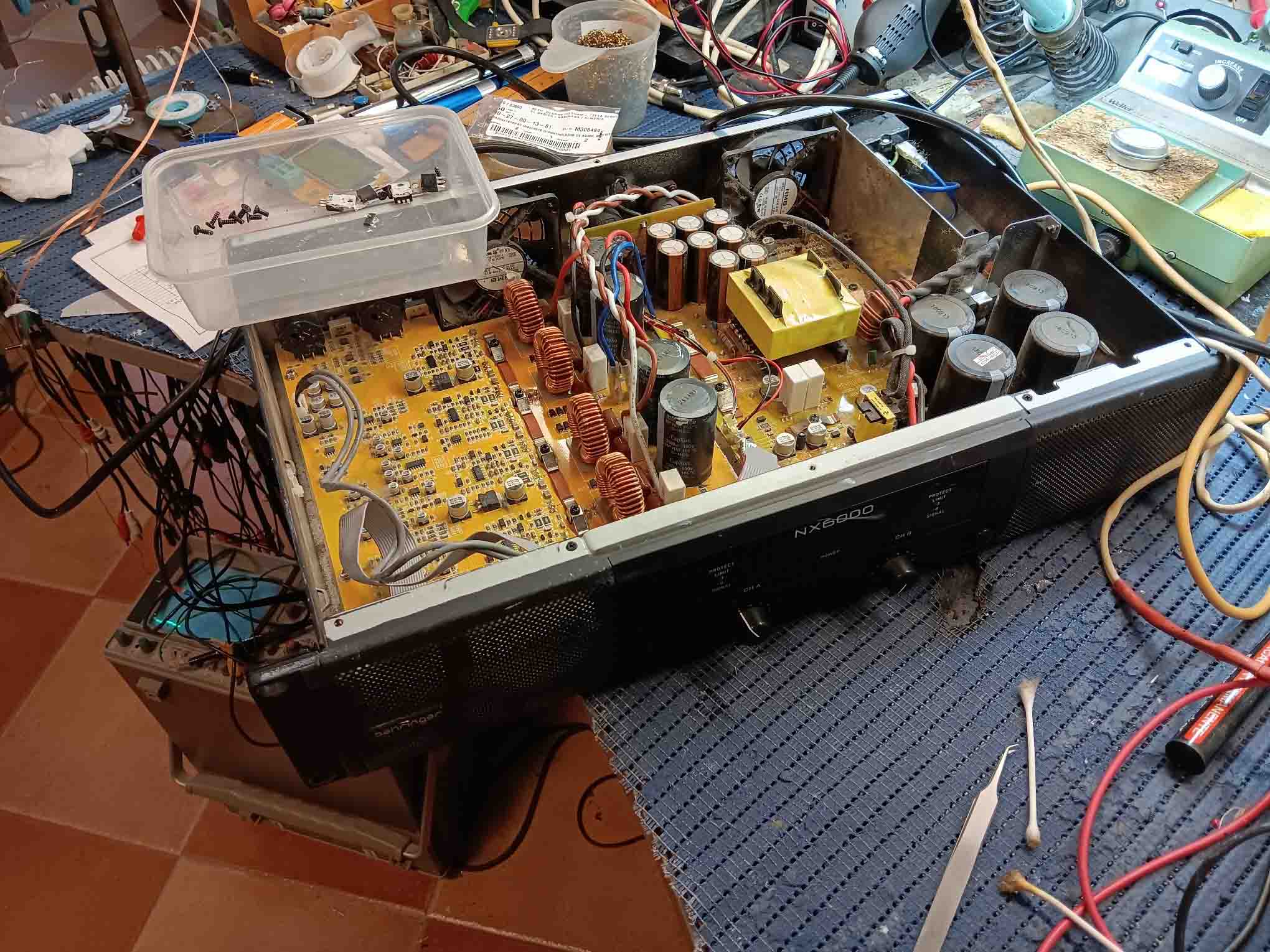 This one came in showing protection mode on both channels. Off with the lid and a quick check around the MOSFETs in circuit showed some odd readings. Now the big thing here, is not to go in quickly and replace the faulty MOSFETs and power it up thinking you will be off to the pub in 10 minutes.