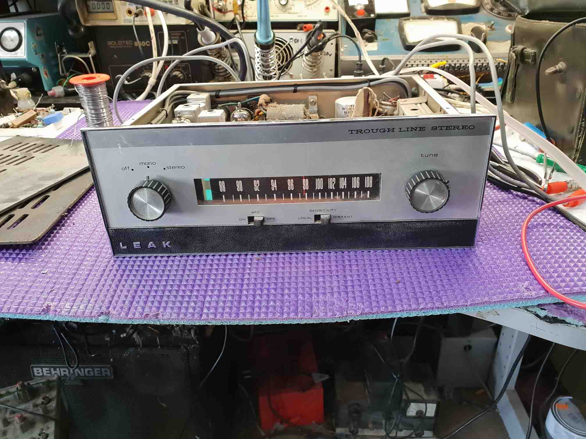 Something nice to work on today. A 50 year old Leak Troughline FM tuner, still with it’s final inspection ticket 11/9/69. Fitted with a Mullard decoder. These tuners are a lovely piece of engineering, using a co-ax line resonator in the oscillator stage, making it very stable. It has an AFC switch, but you never need to use it. This set was in a poor state. The smoothing capdensor block was shot and had stressed the EZ80 rectifier valve beyond help. So it looks original, fitted replacement caps under chassis. Various other capdensors were leaky or open cct, so all changed along with a few resistors which had wondered away from their original value. Upset to have to replace 3 valves, ECF80, ECC88 and an EF80. As the EM84 magic eye had no image, I popped in a reasonable second hand one. Working very well and sounding great. May need a little realignment. Now to give it a good clean up.