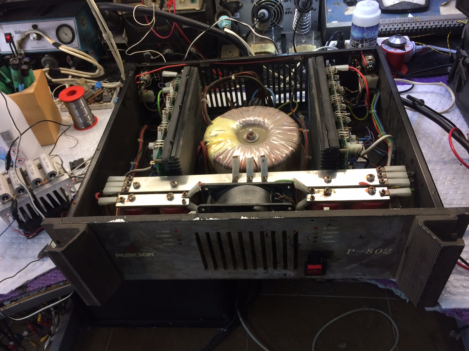 Get a lot of old PA and group amplifiers in. Some, like this one have been round the block a few times. This is a Spanish built amp. probably going back to the late 70s early 80s. Straight forward set up, well made and easy to access. main fault was one shorted output transistor. No other damage done as a result. Being a budget repair, owner was not too bothered about some tired capacitors. Will see it again soon no doubt. These things go on and on, probably helped by a fan big enough to make it hover.