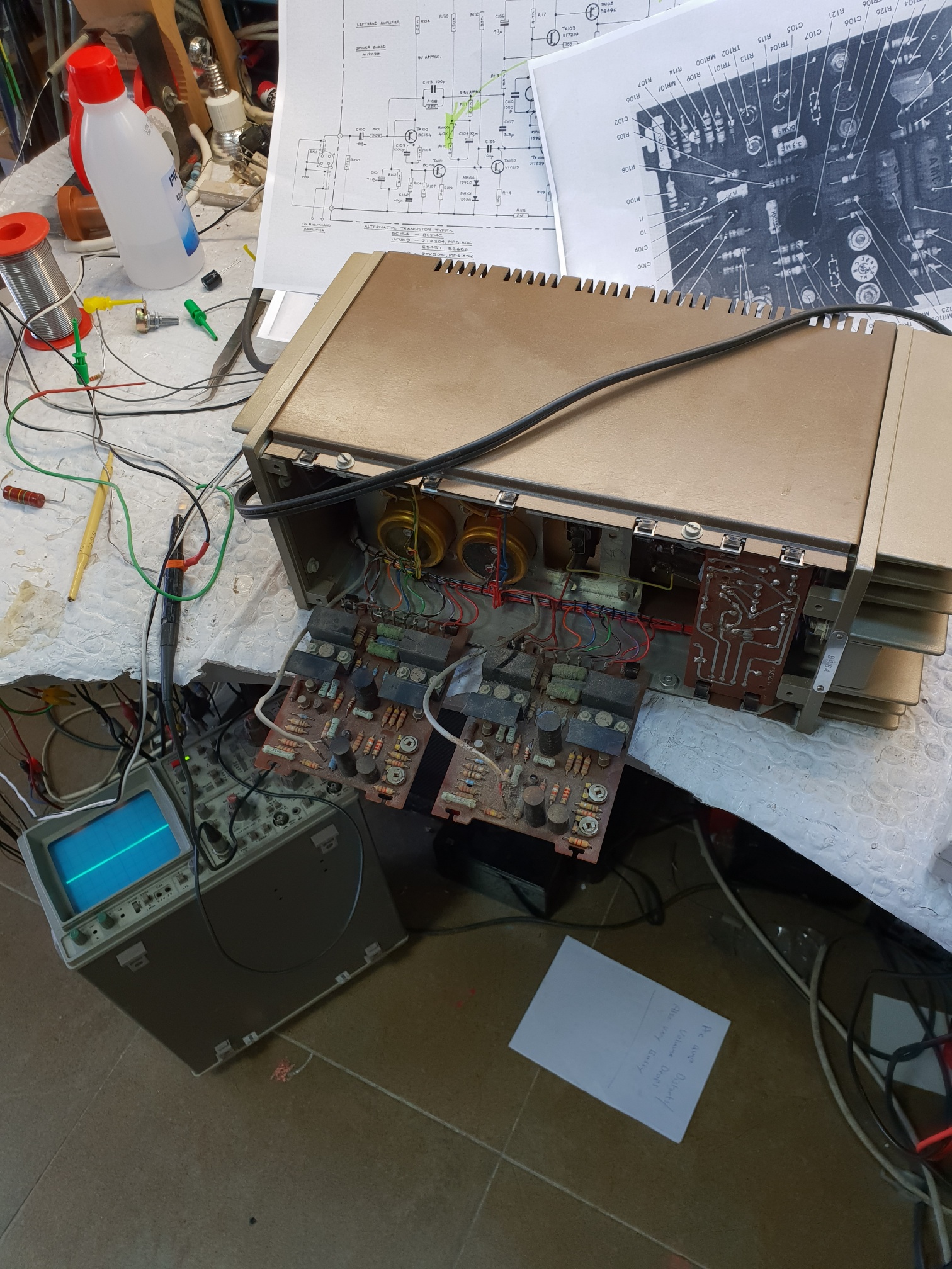 Well that was a surprise. A nice afternoon I thought, quick check over, even with the blindfold on….Oh no…A Quad 33-303 came in with the owner saying there were a couple of faults. One easy, okay. the other.. One channel of the main amp, 303, was down but about 20%. Really annoying. Having to resort to the diagram, scope and lucky rabbits foot. Disconnected the -ve feedback to see where the fault is. I didn’t sign up for a half day’s hassle with one of these. Still not finished. What the hell is going on????? After much head scratching, there seemed to be a combination of faults. Various resistors and a few capacitors. The customer really wanted a budget job and didn’t want to spend too much. So, enough to get it working, but needs more!
